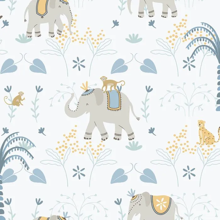 Papel de parede de Elefantes com tons de azul e detalhes com folhagens. Para ambiente infantil ou adolescente.