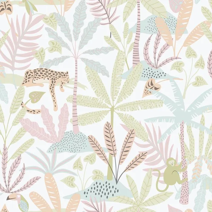 Papel de parede de Folhagens com animais, para ambiente infantil ou adolescente.