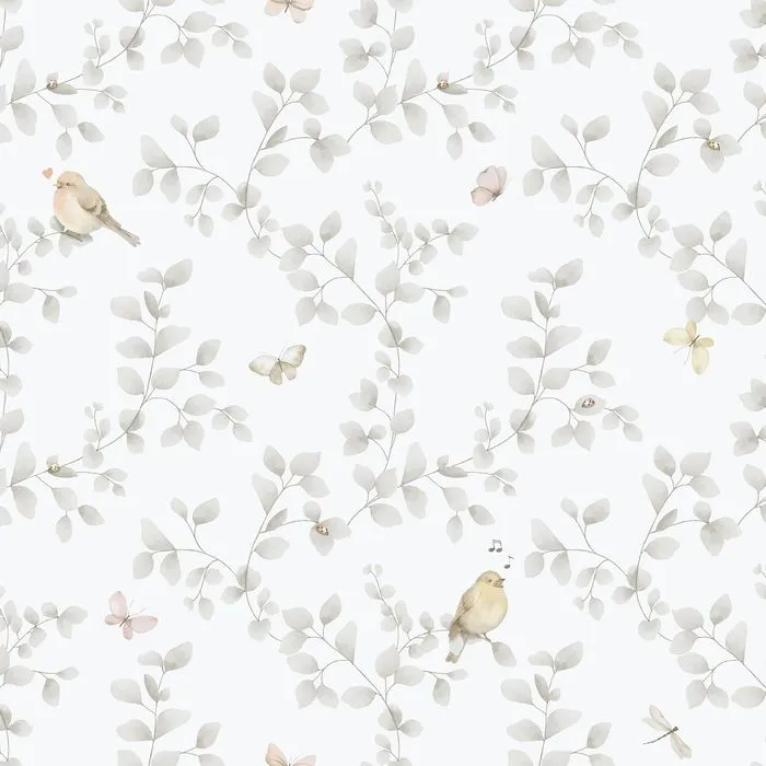 Papel de parede com passaros e folhagens no cinza, para ambiente infantil ou adolescente.